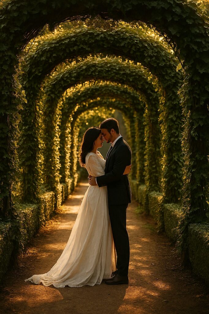 Nature provides stunning backdrops for unique photos. Walking barefoot on the beach with waves at your feet adds romance and serenity. Standing beneath a large oak tree or floral arch frames your love beautifully. A sunset silhouette of the couple kissing creates breathtaking drama. Sitting together on a picnic blanket surrounded by flowers feels intimate and organic.